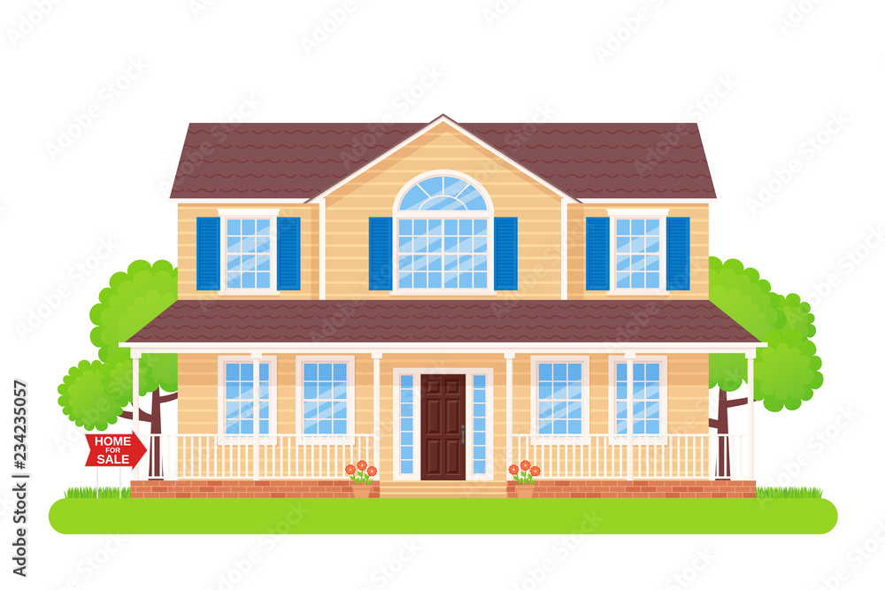 House Sale Sign Vector Advertising Banner Retail Estate Of Residential Property Sale Red Pointer Board With Home Building Cottage Facade Exterior Garden Yard In Flat Design Cartoon Illustration Stock Vector Adobe